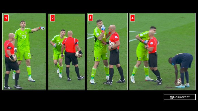 随后为避免洛里效仿自己的心理战术,他立刻捡起皮球交给随后主罚的队友帕雷德斯,继续扮演禁区内的主宰者角色。法国队第4位罚球手穆阿尼出场时,马丁内斯继续采取心理攻势,故意与边线外的法国队教练组发生争执,拖延时间之余还对着穆阿尼说了很多次:“我盯死你了。”虽然吃到了黄牌,但目的完全达到了。再加上楚阿梅尼中计罚失后夸张的耸肩舞,自始至终马丁内斯都在牵着法国队员的鼻子走,牢牢掌握着心理优势。