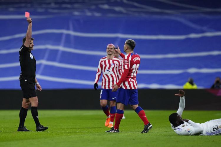 赛后马竞门将奥布拉克抱怨球队在伯纳乌球场吃到红牌是“传统”,事实上本赛季迄今3场马德里德比,马竞每战必有红牌。去年9月首回合是中卫埃尔莫索补时红牌,马竞1比2主场败北;今年1月底国王杯,又是中卫萨维奇补时第9分钟红牌,导致10人应战的马竞加时赛被皇马连入2球出局。难怪马竞公开抗议,俱乐部在官方账号也晒出科雷亚血迹斑斑的腿部照片,暗示应该被红牌罚下的是皇马球员。不过,科雷亚下半场的肘击动作被罚下并无争议。