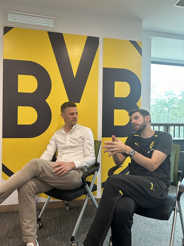 本杰明:我们会一直给此次合作提供支持,为了更好地培训球员,我们会在日常训练规划、球员考察以及交流活动等方面进行一些活动。此外,我们的青训学院也会上传训练课的录像,并对其进行分析,这是我们俱乐部在德国工作的一个重要组成部分。然后就是交流项目,我们已经把一支多特蒙德的U15梯队带到这里,为了做到这一点,我们必须提前几个月计划好比赛日程,那些孩子还得上学,我们需要得到家长的同意,把他们带到这里比赛还需要合适的对手。