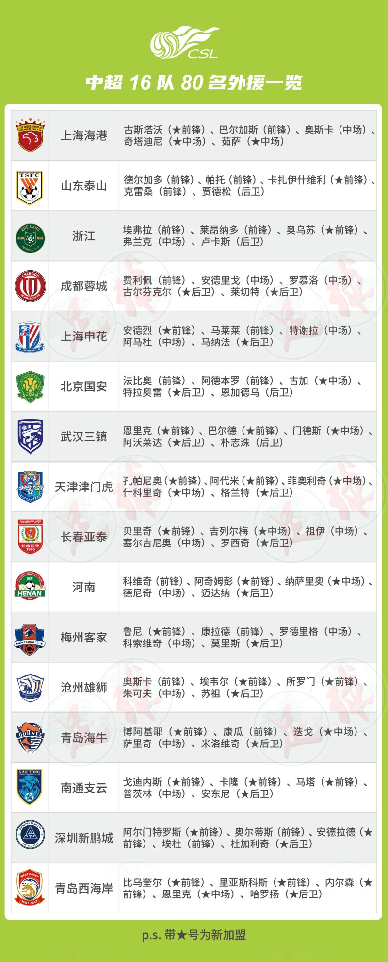 记者陈永报道 本赛季,中超外援政策更改,由以往的“7654”调整了“7655”,每场比赛可登场5名外援,在此前结束的超级杯上,上海申花便排出了五外援的首发阵容。而在转会窗口即将关闭之前,包括青岛海牛和沧州雄狮在内的几家俱乐部,也总算解除了引援禁令并完成外援注册报名,至此,中超16支球队全都完成五外援配置,合计80名外援闯荡2024中超。