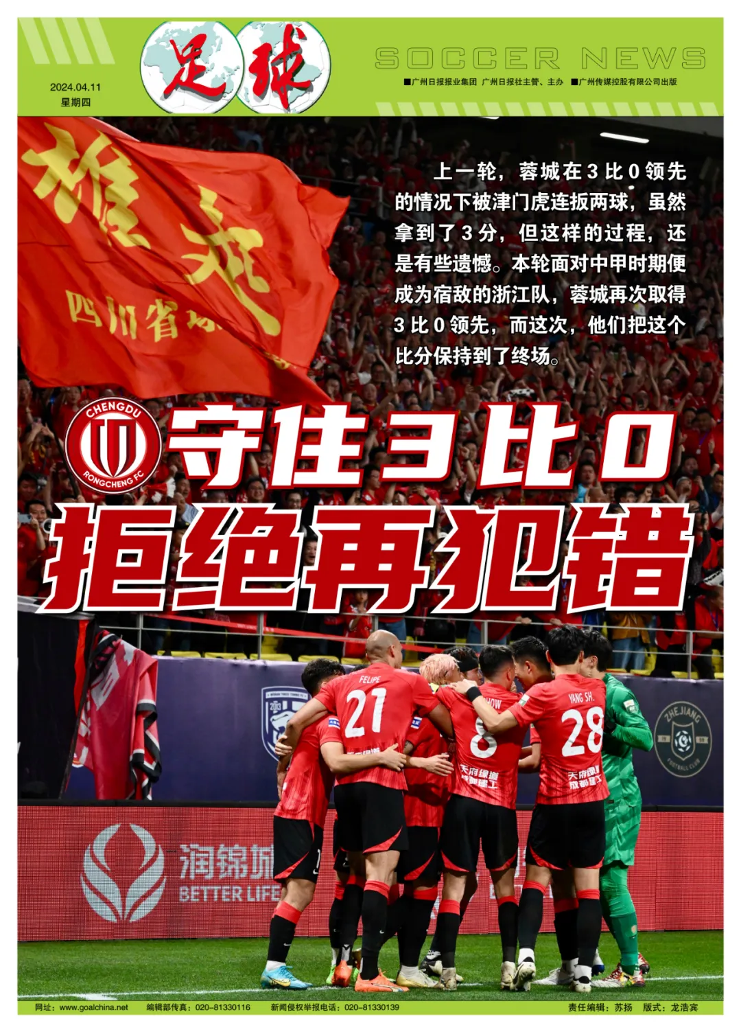 3比0领先后,蓉城没有放松,依旧全神贯注,没有犯上一场的“错误”。赛后,徐正源透露,这几天,他一直和球员们强调,终场哨不响,比赛就没有结束,一定要坚持到底。