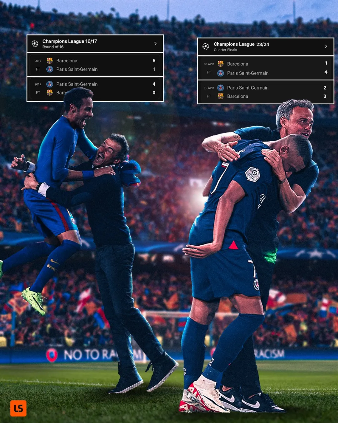 而面对另一位故人,巴萨拥趸们心中更是五味杂陈——赛前还在喋喋不休自己才是巴萨传控足球代表的恩里克,不仅成为首位带队在欧冠淘汰旧主的前巴萨教练,更在两队队史和欧冠历史中写下辉煌一笔:7年前在诺坎普带巴萨完成对大巴黎的6比1惊天大逆转,7年后他带大巴黎在蒙锥克山4比1逆转巴萨,当真是命运的巧合?