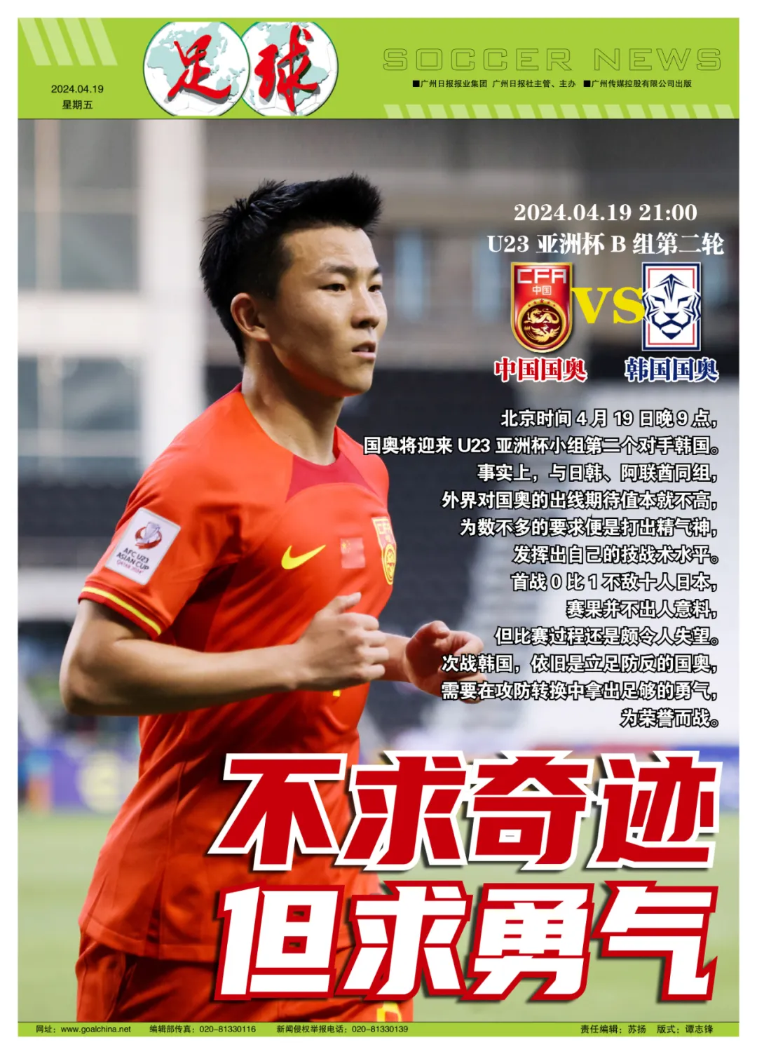 记者鲁蜜、寒冰报道 北京时间4月19日晚9点,中国国奥将迎来U23亚洲杯小组第二个对手韩国国奥。事实上,与日韩、阿联酋同组,外界对国奥的出线期待值本就不高,为数不多的要求便是打出精气神,发挥出自己的技战术水平。首战0比1不敌十人日本,赛果并不出人意料,但比赛过程还是颇令人失望。次战韩国,依旧是立足防反的国奥,需要在攻防转换中展现勇气、提升效率,为荣誉而战。