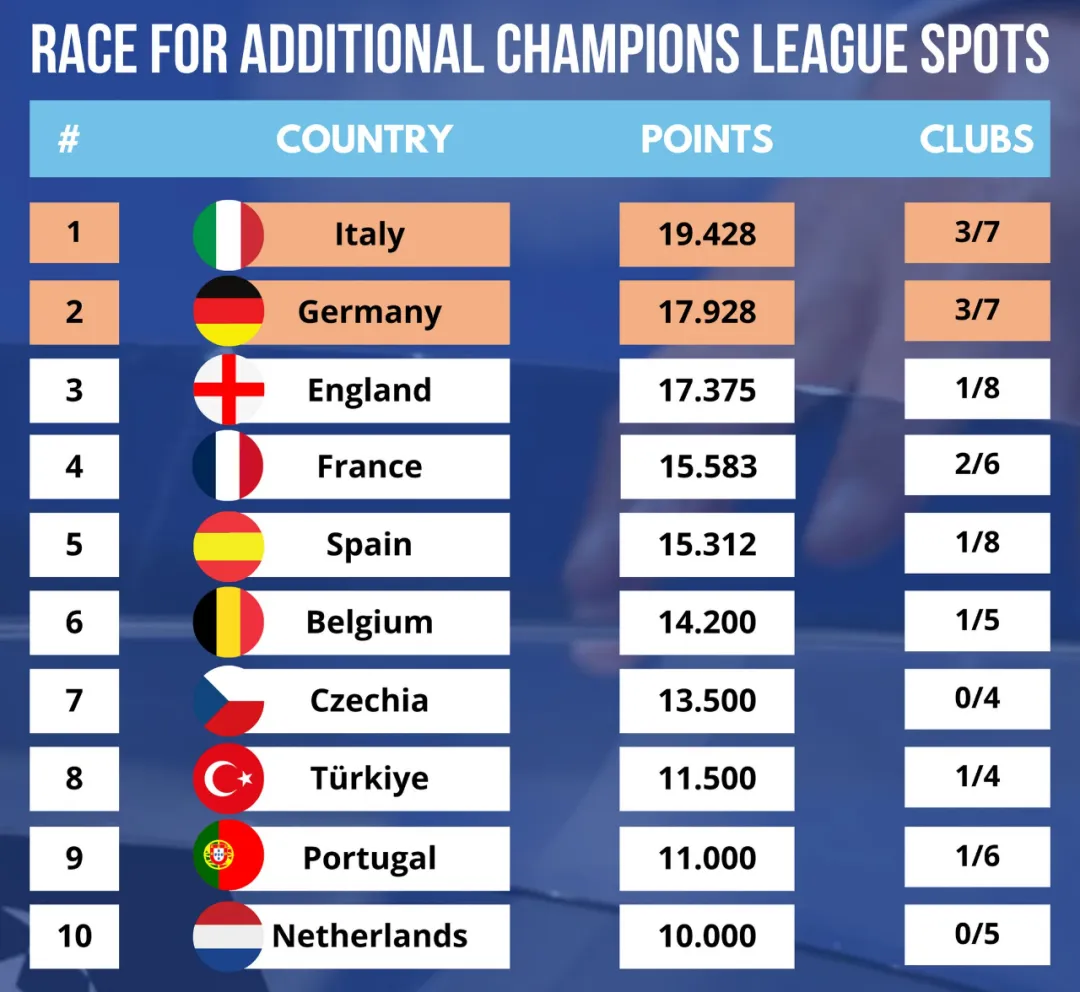 意甲(19.429分)因罗马、亚特兰大和佛罗伦萨分别进入欧联杯和欧协杯四强,已提前锁定下赛季1个欧冠奖励名额。新赛季意甲前5名将参加欧冠,目前排名第5的罗马很可能受益。德甲目前 积分(17.929分)领先英超(17.375分),德甲在两大杯4强还有3支球队,英超仅存1支。即便维拉在欧协杯剩余3场全胜夺冠,英超总积分最高只能达到18.250分。德甲3队剩余至少6场比赛,只需再拿到1胜1平(4分)就能锁定另1个欧冠奖励名额。考虑到勒沃库森如今是欧联杯夺冠最 大热门,拿到这个分数并非难事。这也意味着目前排名德甲第5的多特蒙德,将因此拿到下赛季欧冠参赛资格。
