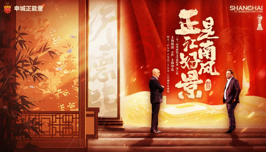 赛前,海港的出征海报印上了“正是江南好风景”,配上两位主帅的小图,相比较于此前几个赛季霸气外露的口号,这幅海报看起来是风轻云淡、岁月静好的样子。但实际上,这段诗词的后一句是“落花时节又逢君”,或许这样的解读才真正诠释了海港在赛前对于本场德比的态度。