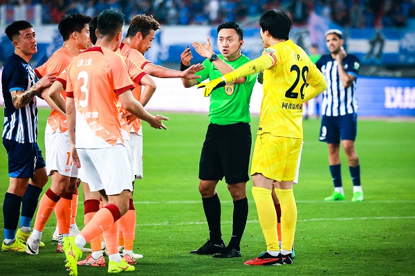 第70分钟,邓涵文在禁区内手球,慢动作显示,邓涵文大臂紧贴身体,但小臂又紧贴着大臂抬起,主裁判并没有判罚点球,现场来看,VAR也没有介入,青岛海牛教练组抗议之后拿到了黄牌。
