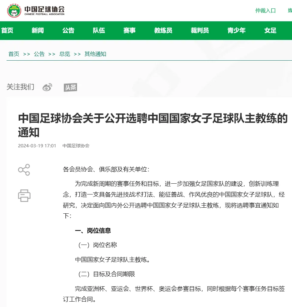记者王伟报道 自从水庆霞离任中国女足主教练帅位之后,中国女足帅位一直空缺。今年3月19日,中国足协通过官网发布全球公开选聘女足国家队主教练。