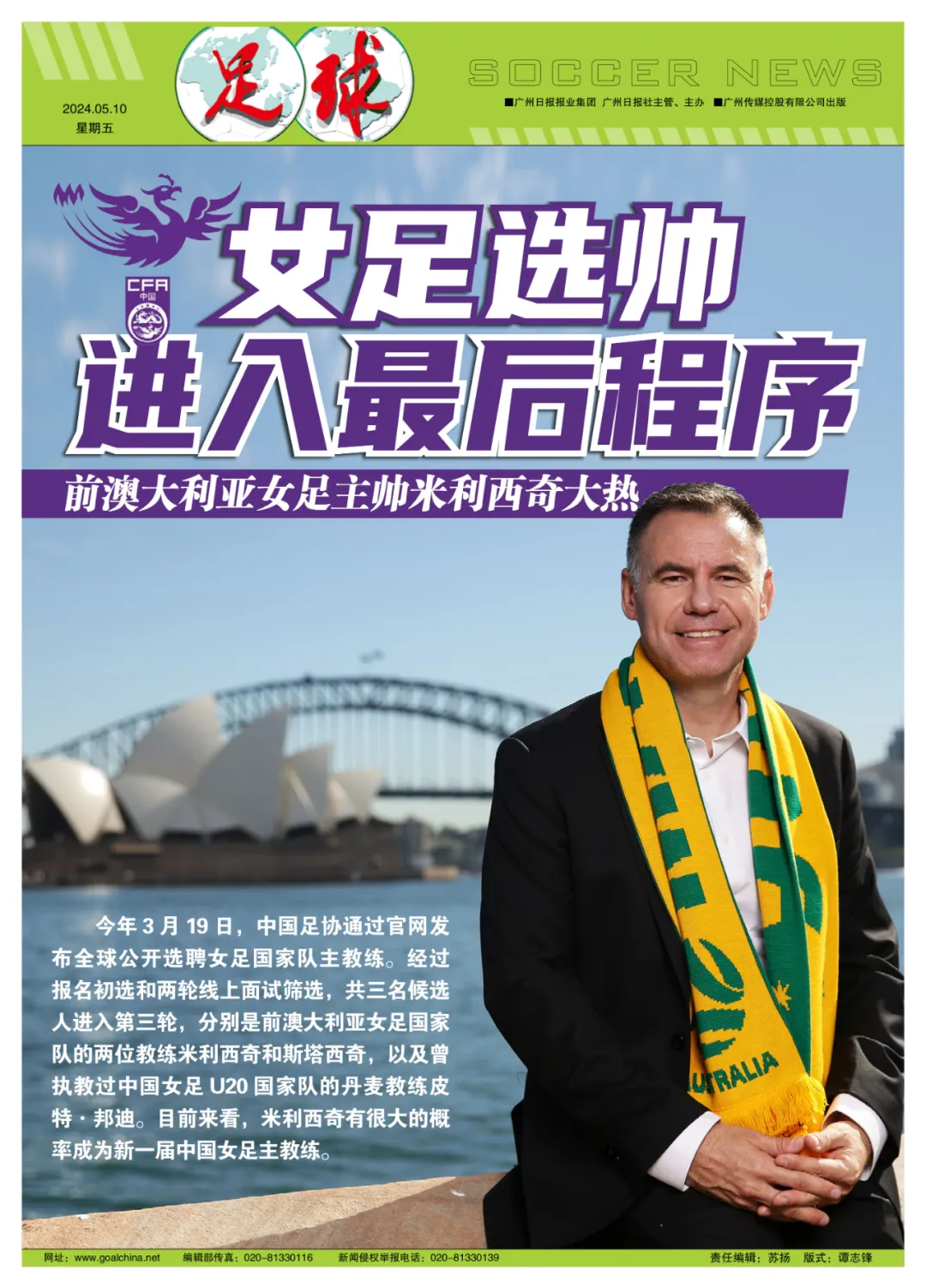 据了解,作为澳大利亚女足前主教练的米利西奇有望于近期抵达中国进行最后选聘阶段的面谈,目前他是新一任中国女足主教练的最热门人选。如果一切顺利,米利西奇出任中国女足主帅将进入最后的审批程序。