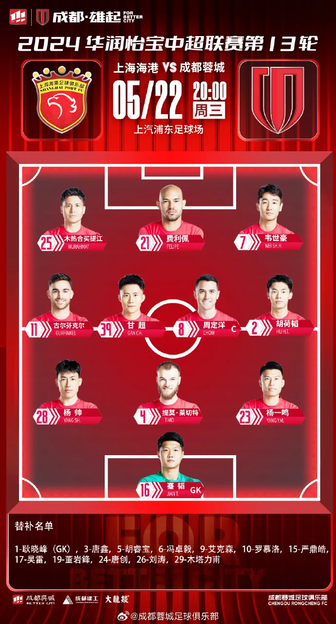 蓉城连续第二个客场,上轮长时间少打一人,消耗较大。本场比赛,主帅徐正源进行了一些轮换,阵型也做出了调整。