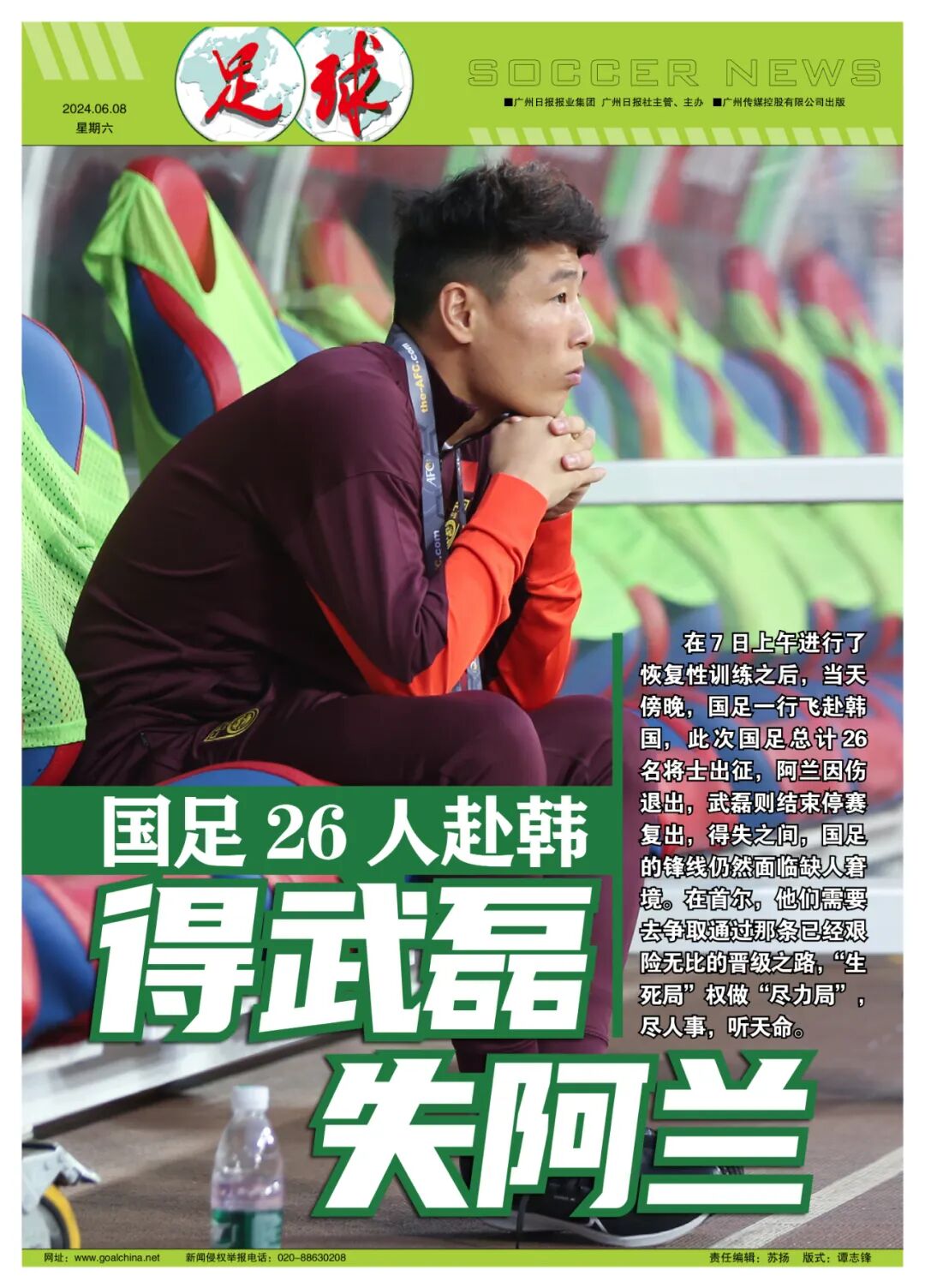 此次出征韩国,国足总计26名球员,即原有的30名球员去掉了停赛的李源一,以及受伤的高准翼和李帅,再加上阿兰。武磊在中泰之战中停赛,但中韩之战他可以复出,自然在出征阵容之中。