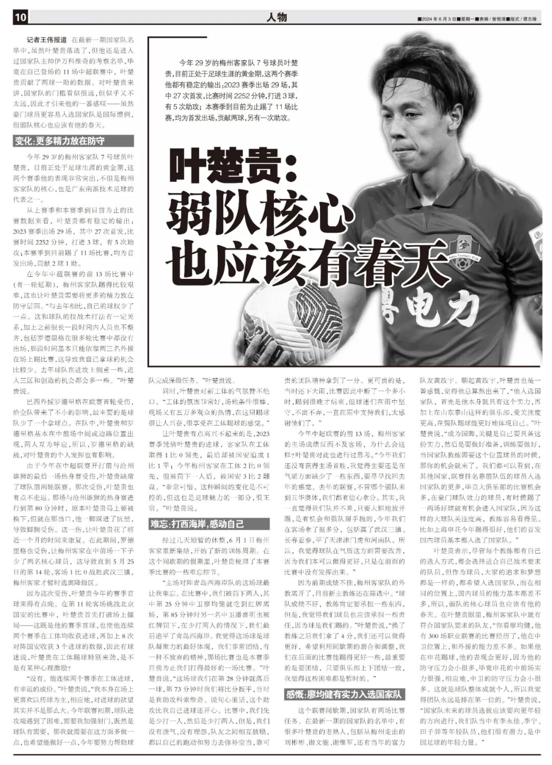 在今年中超联赛的前13场比赛中(有一轮延期),梅州客家队踢得比较艰难,这也让叶楚贵需要将更多的精力放在防守层面。“与去年相比,自己的球权少了一点。这和球队的技战术打法有一定关系,加上之前很长一段时间内人员也不整齐,包括罗德里格在很多轮比赛中都没有出场,那段时间基本只能依靠两三名外援在场上踢比赛,这导致我自己拿球的机会比较少。去年球队在进攻上侧重一些,进入三区和创造的机会都会多一些。”叶楚贵说。