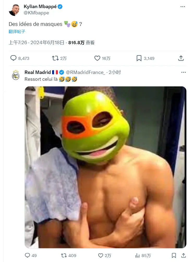 姆巴佩将进行保守治疗并戴着面部护具训练,心情不错的姆巴佩赛后居然在社媒账号征集防护面具造型。皇马法语社媒以及大部分球迷们建议戴着“忍者神龟”造型防护面具,也有人认为姆巴佩应像经典电影《铁面人》中的法王路易十四与弟弟菲利普一样,戴上造型更夸张的“铁面具”。