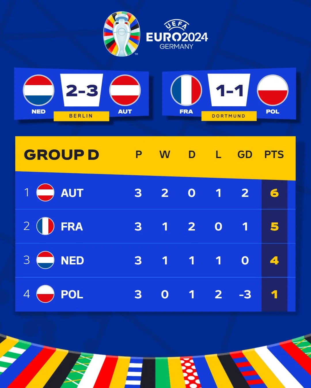 此时,D组出线形势又变化为:荷兰第一,法国第二,奥地利第三。但第80分钟,萨比策爆射再次反超比分,并最终锁定胜局,而法国始终未能改写比分,最终,奥地利力压法荷两强拿到小组第一。