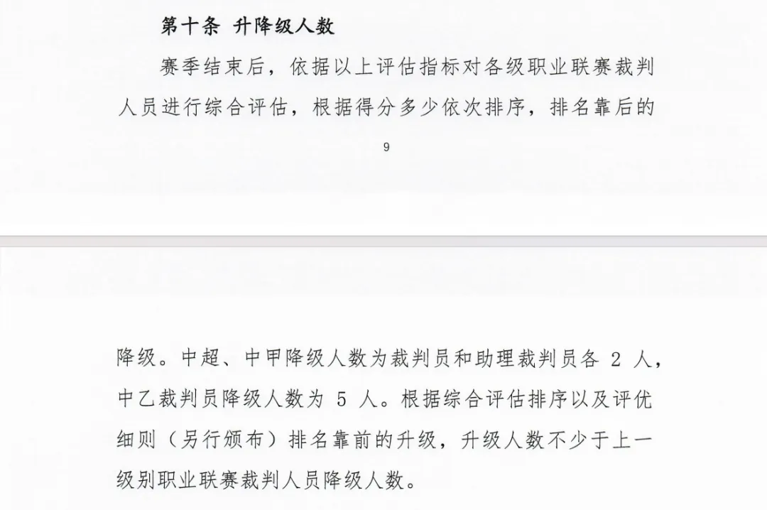 在上述基础上,中超和中甲的降级人数为裁判员和助理裁判员各2人,中乙裁判员降级人数则是5人;升级人数不少于上一个级别职业联赛的降级人数。