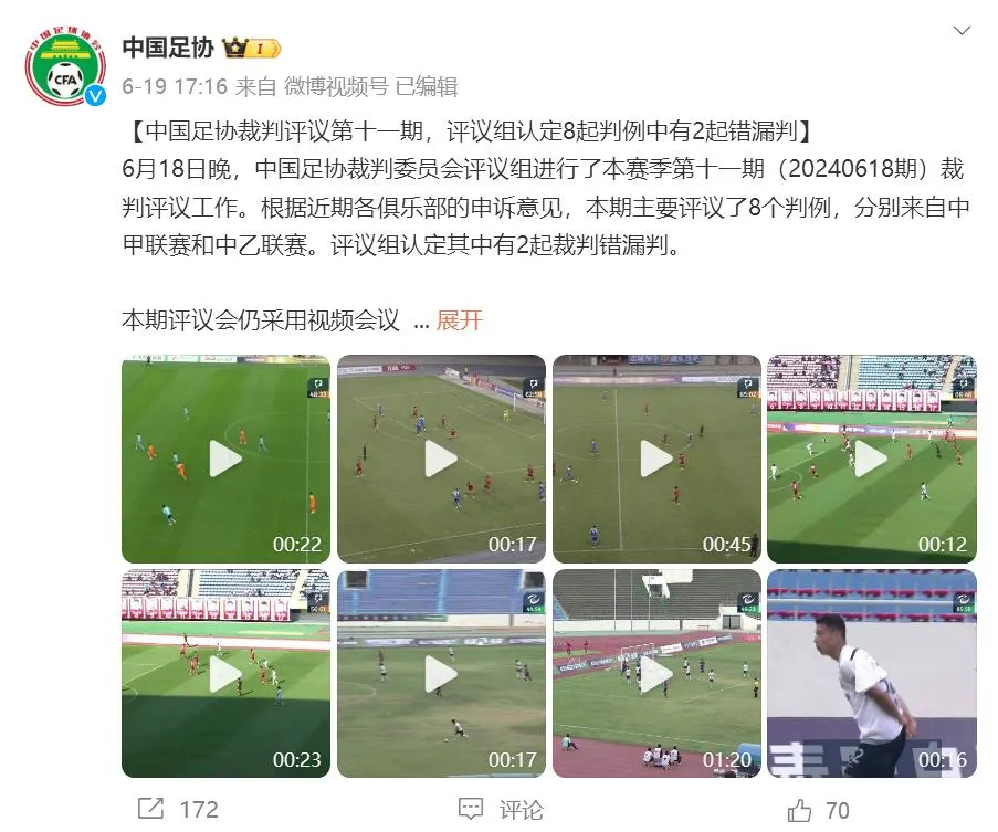 目前为止,中国足协总共公布了11期的裁判评议,除了中超、中甲、中乙三级男子足球职业联赛之外,还涵盖足协杯、女超等赛事。