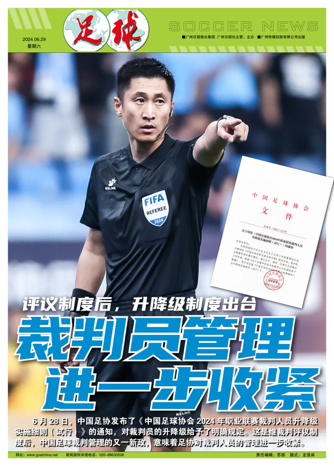 记者陈永报道 6月28日,中国足协发布了《中国足球协会2024年职业联赛裁判人员升降级实施细则(试行)》的通知,对裁判员的升降级给予了明确规定。这是继裁判评议制度后,中国足球裁判管理的又一新政,意味着足协对裁判人员的管理进一步收紧。