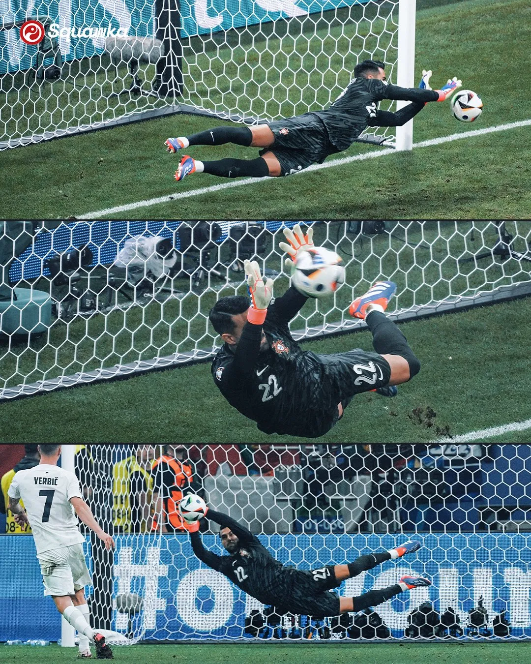 这次救命的扑救,只是迪奥戈·科斯塔天秀表演的前戏,随后点球大战,他先后扑出伊利契奇、巴尔克维持和韦尔比奇的点球,成为欧洲杯史上首位点球大战连续扑出3个点球的门神,而葡萄牙三罚全中,在点球大战完胜晋级。赛后,点球大战中重新振作第一个站上点球点将功补过的C罗在社媒赛出了三张照片,高举合十致歉、与老友佩佩的赛后庆祝,以及与自己并肩而立的迪奥戈·科斯塔——感激之情,溢于言表。