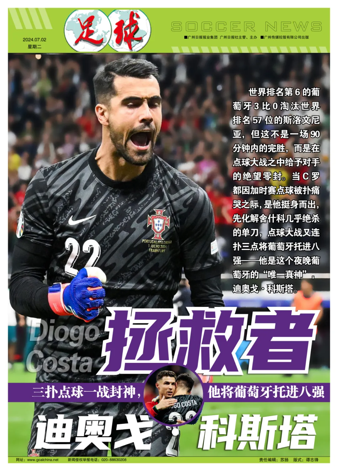 记者寒冰报道 世界排名第6的葡萄牙3比0淘汰世界排名57位的斯洛文尼亚,但这不是一场90分钟内的完胜,而是在点球大战之中给予对手的绝望零封。当C罗都因加时赛点球被扑痛哭之际,是他挺身而出,先化解舍什科几乎绝杀的单刀,点球大战有连扑三点将葡萄牙托进八强——他是这个夜晚葡萄牙的“唯一真神”:迪奥戈·科斯塔。
