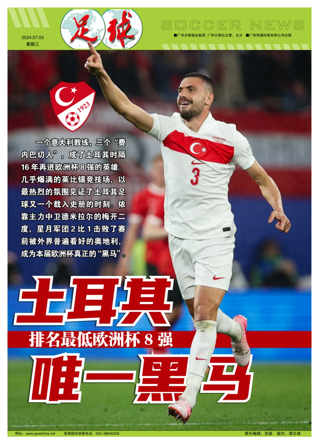 一个意大利教练,三个“费内巴切人”,成了土耳其时隔16年再进欧洲杯8强的英雄。几乎爆满的莱比锡竞技场,以最热烈的氛围见证了土耳其足球又一个载入史册的时刻。依靠主力中卫德米拉尔的梅开二度,星月军团2比1击败了赛前被外界普遍看好的奥地利,成为本届欧洲杯真正的“黑马”。
