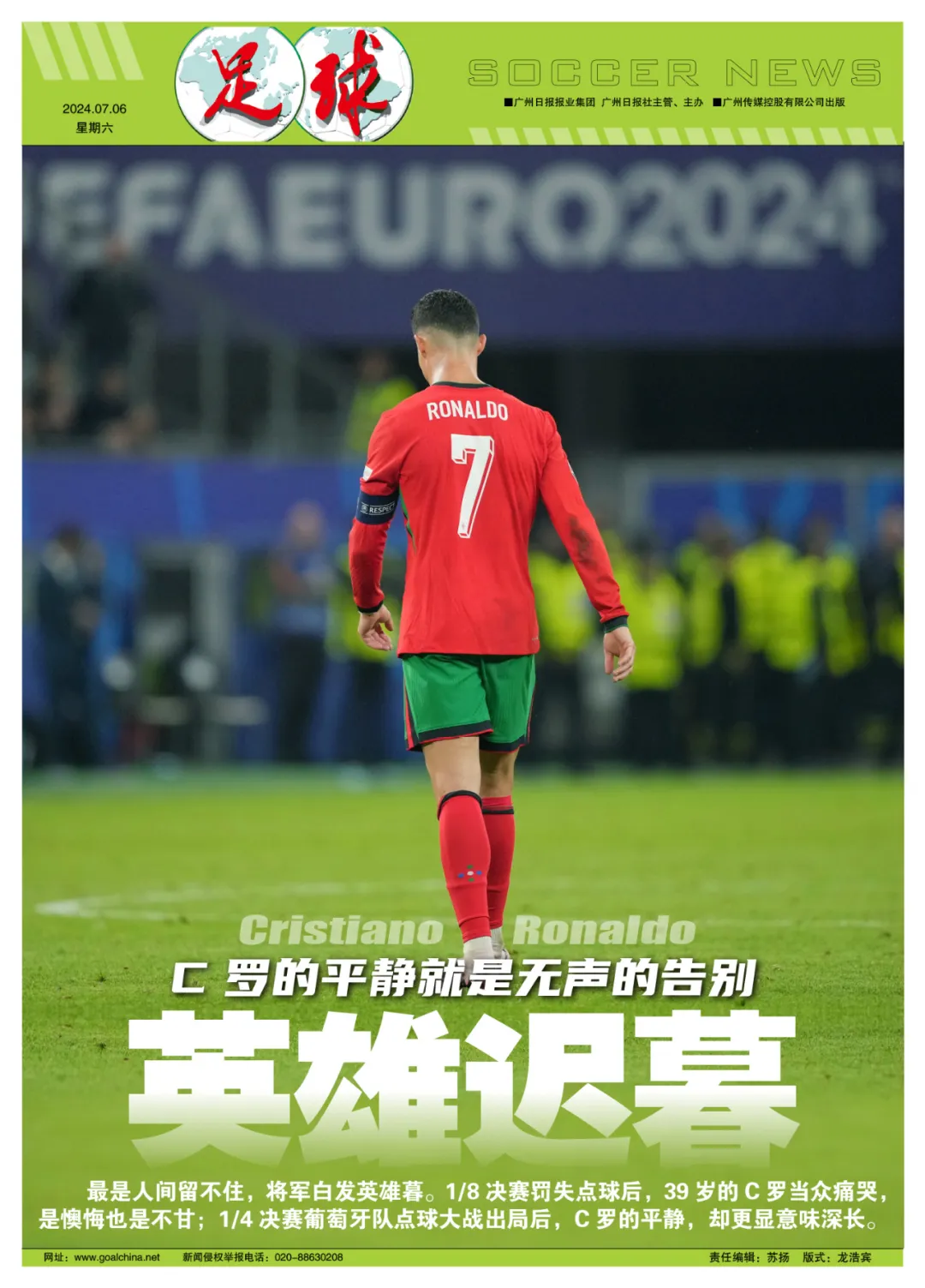 时光的流逝如此公平,也如此残酷,即便像C罗这样如此苛刻地自律,保持身体和竞技状态,还是无法挡住告别一刻如期而至。C罗连续5届欧洲杯、连续10届大赛进球纪录止于汉堡,这就是命运安排给他的结局。即便葡萄牙全队依旧在尽可能为C罗提供弹药,他还是无法用进球帮助球队。葡萄牙主帅马丁内斯赛后的话可以作为C罗对未来的期待:“我们很伤心难过。这是一个我们竭尽了全力的时期。我们要看的不仅仅是欧洲杯,欧洲杯后,还有生活。”