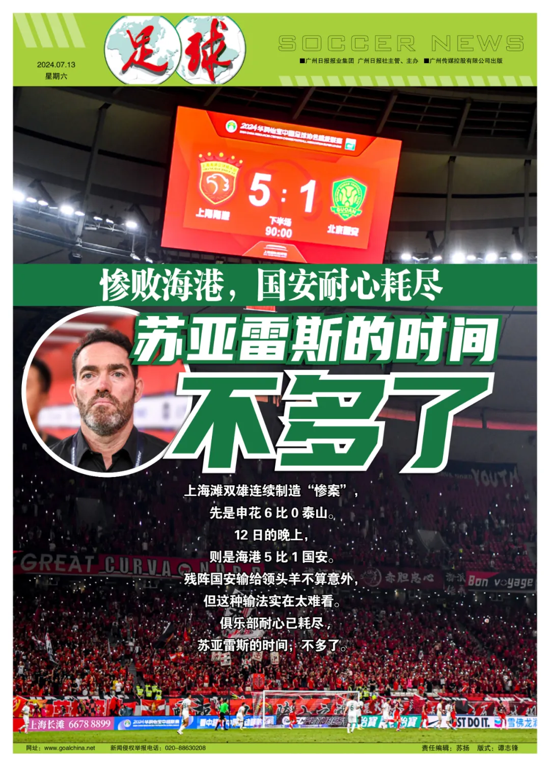 上海滩连续上演“惨案”,先是申花6比0泰山,12日的晚上,则是海港5比1国安。残阵国安,输给领头羊正常,但这种输法很难看,俱乐部耐心已耗尽,苏亚雷斯的时间,不多了。