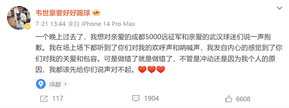 韦世豪在事发第二天,就在个人社交媒体上,为自己的行为道歉,他表示:“我想对亲爱的成都5000远征军和亲爱的武汉球迷们说一声抱歉。我在场上场下都听到了你们对我的欢呼声和呐喊声,我发自内心地感觉到了你们对我的关爱和包容。可是做错了就是做错了,不管是冲动还是因为我个人的原因,我都该先给你们说声对不起。”