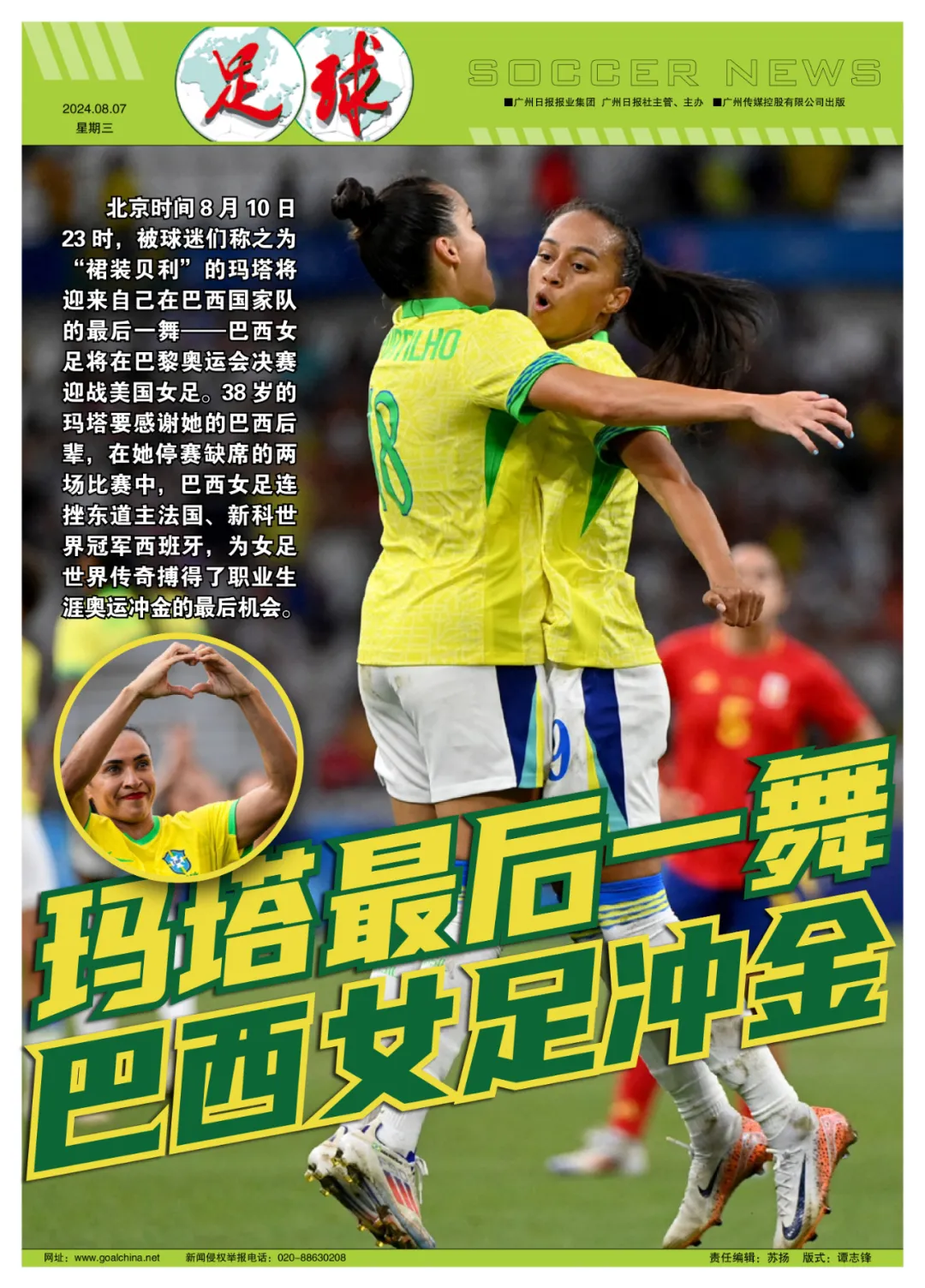 记者寒冰报道 北京时间8月10日23时,被球迷们称之为“裙装贝利”的玛塔将迎来自己在巴西国家队的最后一舞——巴西女足将在巴黎奥运会决赛迎战美国女足。