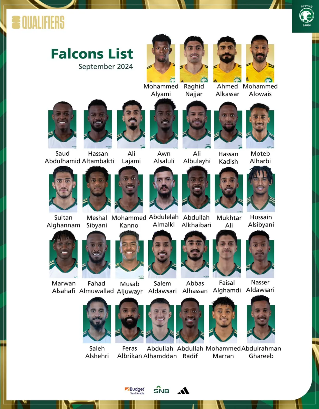 相比6月36强赛的大名单,主帅曼奇尼放弃了6名球员,包括门将阿布西(利雅得青年)、后卫布赖克(利雅得新月)、后卫哈米德(吉达联合)、中场艾哈迈德·加姆迪(吉达联合)、叶海亚(利雅得胜利)、纳杰(利雅得胜利)。