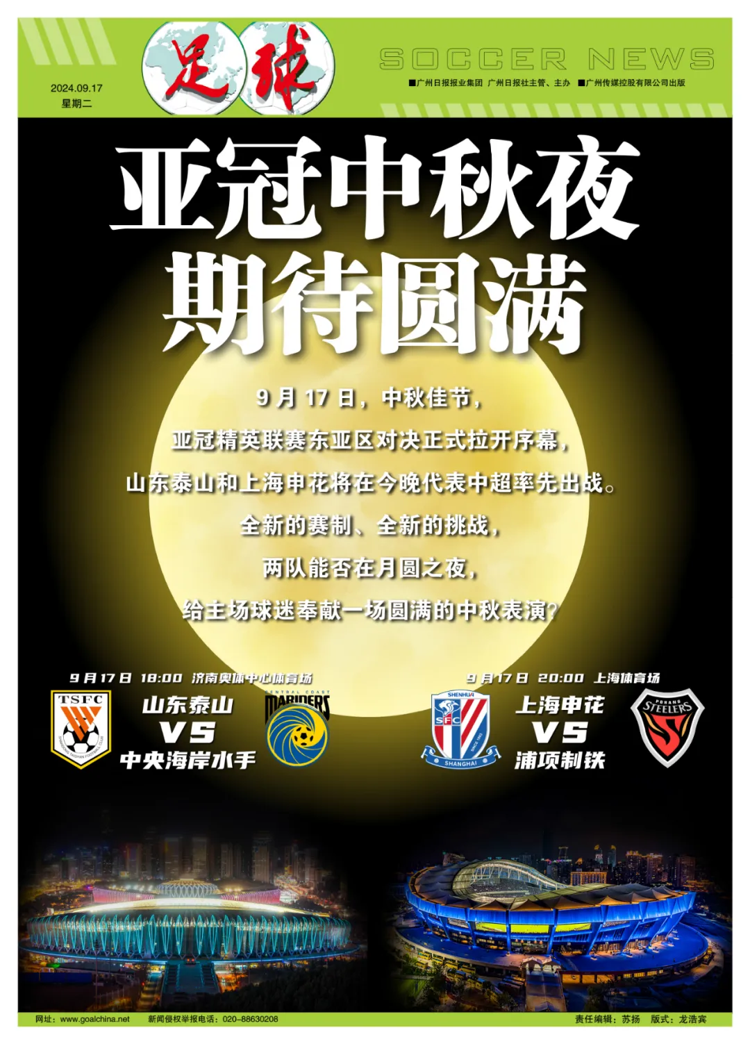 9月17日,中秋佳节,亚冠精英联赛东亚区对决正式拉开序幕,山东泰山和上海申花将在今晚代表中超率先出战。全新的赛制、全新的挑战,两队能否在月圆之夜,给主场球迷奉献一场圆满的中秋表演?