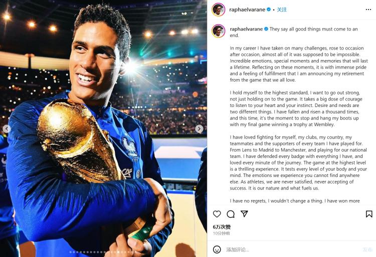 那次膝盖严重受伤,导致瓦拉内至少要伤停6个月,意味着明年2月底冬窗截止前都未必能痊愈。所以,科莫俱乐部没有为瓦拉内在意甲注册,球员本人也开始思考是否结束职业生涯。周二《巴黎人报》披露,瓦拉内决定退役,昨天,法国中卫在个人社媒上发表了饱含不舍之情的长篇退役声明。他表示,退役是因为对自己有很高要求,想以最佳状态继续比赛,而不仅仅是维持现状。