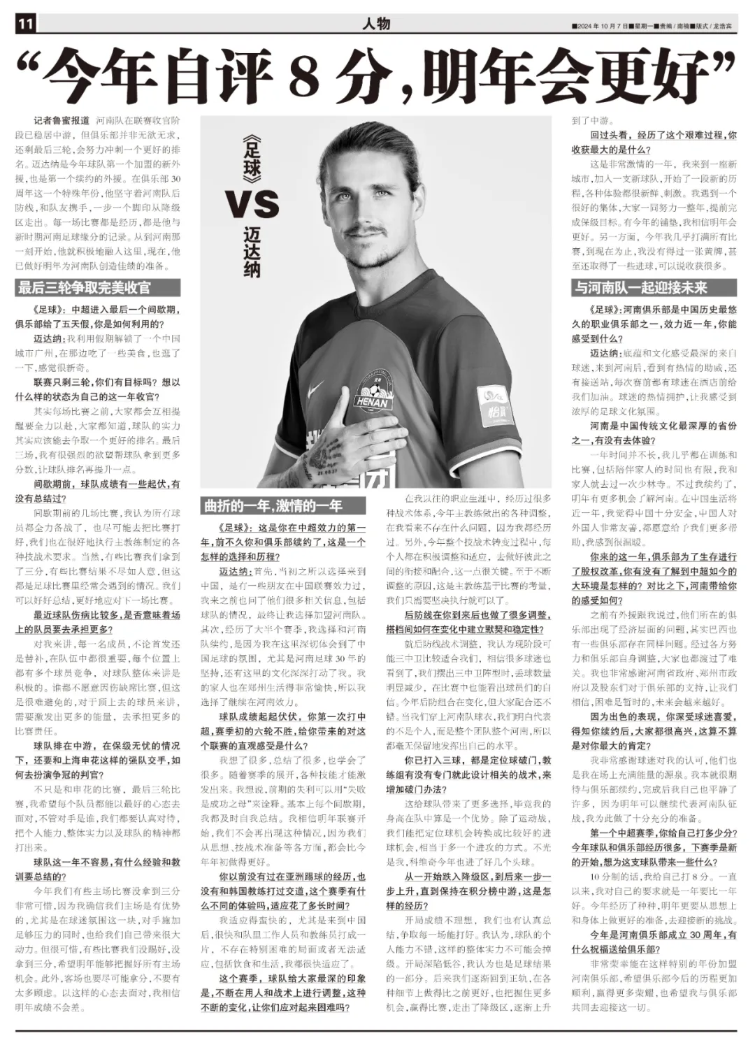 河南队在联赛收官阶段已稳居中游,但俱乐部并非无欲无求,还剩最后三轮,会努力冲刺一个更好的排名。迈达纳是今年球队第一个加盟的新外援,也是第一个续约的外援。在俱乐部30周年这一个特殊年份,他坚守着河南队后防线,和队友携手,一步一个脚印从降级区走出。每一场比赛都是经历,都是他与新时期河南足球缘分的记录。从到河南那一刻开始,他就积极地融入这里,现在,他已做好明年为河南队创造佳绩的准备。