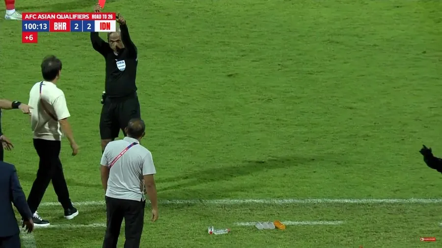 客战巴林,印尼队本对3分志在必得,但因阿曼裁判阿尔卡夫“超长补时”,导致巴林队补时超时3分钟时攻入绝平球,将印尼队近在咫尺的3分变成1分。赛后印尼全国都还在猛烈抨击阿曼裁判,而在现场,从球员到教练和球队经理,都表现出了一定的过激行为。同时,对于下一战,他们对裁判的关注,更甚于对国足的关注。