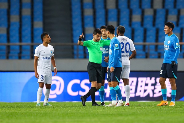 第77分钟,罗萨禁区转身传中疑似打在郑达伦手上,主裁判金京元第一时间判罚点球!然而,经过VAR提示,手球并不成立,球先打在了郑达伦的肋部。金京元在场边经过长时间回看,最终推翻了自己第一时间的判罚,南通再次与进球失之交臂。