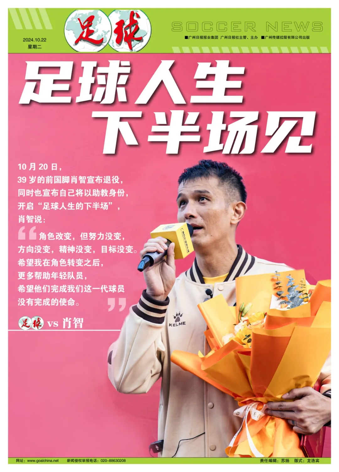 肖智:这段时间我回顾了自己职业生涯的每一段经历,在南京有有、河南建业、广州富力、天津泰达、河北卓奥、青岛海牛、辽宁沈阳城市、广州豹的每一个细节。在做出退役决定之前,我也想了很久,我发现自己是1985年出生的这批球员中最后一个退役的,踢到现在,有时候也很孤独(笑)。