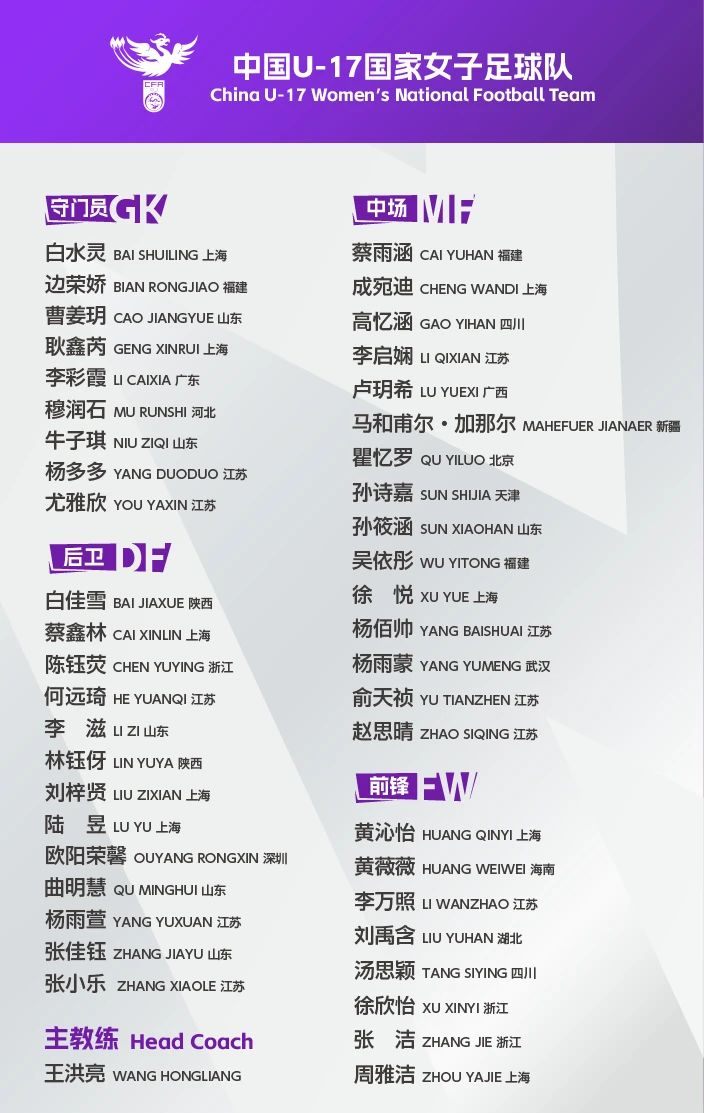 名单中,来自江苏女足的门将尤雅欣、浙江女足的前锋张洁和陕西女足的后卫林钰伢都参加了今年5月的U17亚洲杯,同样参加了U17亚洲杯的北京女足后卫宋语和上海女足的前锋周欣怡由于跨级参加科林·贝尔的U20女足国青集训,无缘本期名单,同样无缘且打了U17亚洲杯的还有山东女足的中场张克璨。