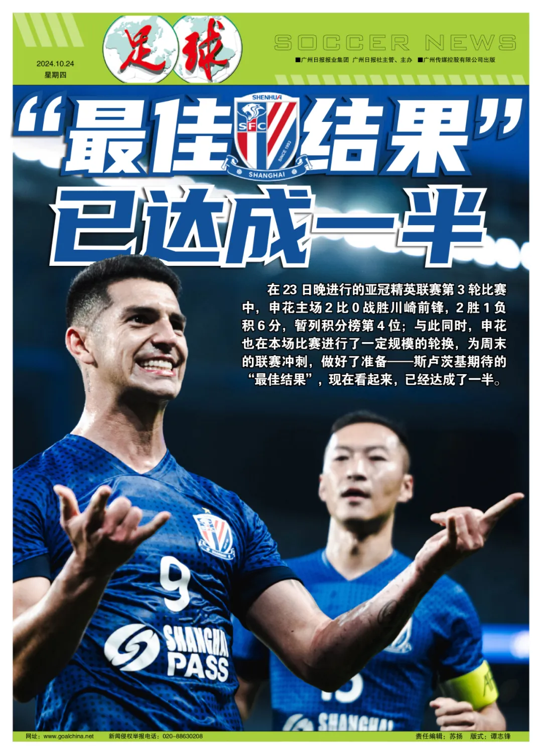 特约记者甘慧报道 斯卢茨基期待的“最佳结果”,现在看起来,已经达成了一半。在23日晚进行的亚冠精英联赛第3轮比赛中,申花主场2比0战胜川崎前锋,2胜1负积6分,暂列积分榜第4位。