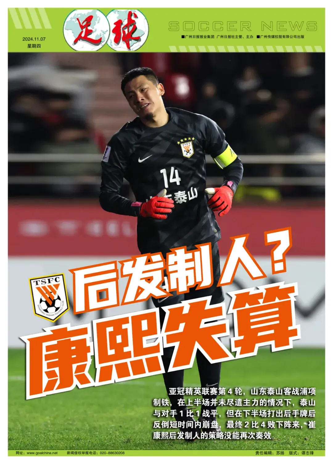 补时阶段,毕津浩头球扳回一球,最终,泰山2比4输掉了比赛。