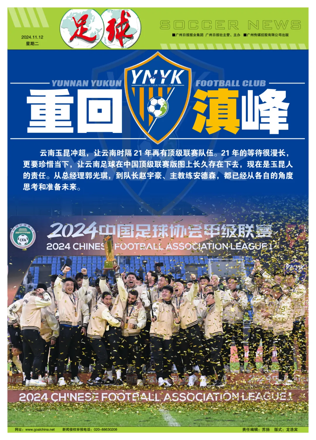 “中超,云南来晚了。”云南玉昆俱乐部总经理郭光琪在俱乐部夺冠仪式上说道。他的语气深沉,既是向中国足球表达了云南足球归来的诚意,也是对过去21年云南足球在中国足坛版图缺失的歉意。2021年,在云南省体育局牵头下,云南玉昆从中冠打起,历经三年多的时间,逐年升级,终于让云南足球史上第一次有了中超球队。