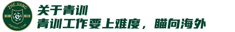 这些年我们在青训工作上有很多收获,为各级国字号培养了不少球员,在整个中国职业联赛中也有不少绿城出品的职业球员,未来我们还会坚持做好青训工作,但是,我们想把工作重点做一个升级,给青训增加一点难度,我们想把目标瞄向海外,瞄向世界足坛,希望未来我们可以培育出有能力在世界舞台上立足的优秀球员。经过这些年的摸索和探讨,我们已经有了初步的规划,会把工作重点放在输送球员留洋上,已经做了一些尝试。留洋不是简单地选一些球员把他们送出去,让他们独自去适应,也不是放了团队陪伴他们适应就够了,而是需要更早地做准备,锻炼其相应的能力,是一个系统工程。希望未来我们在这方面能够有所突破,能为国家做贡献。