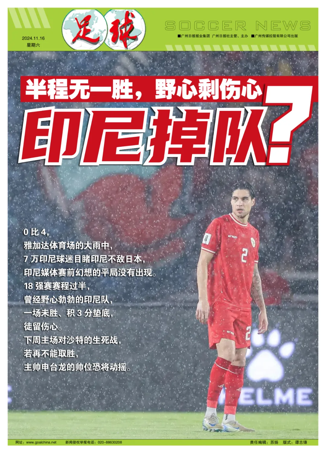 0比4,雅加达体育场的大雨中,7万印尼球迷目睹印尼不敌日本,印尼媒体赛前幻想的平局没有出现。18强赛赛程过半,曾经野心勃勃的印尼队一场未胜、积3分垫底,徒留伤心。下周主场对沙特的生死战,若再不能取胜,主帅申台龙的帅位恐将动摇。