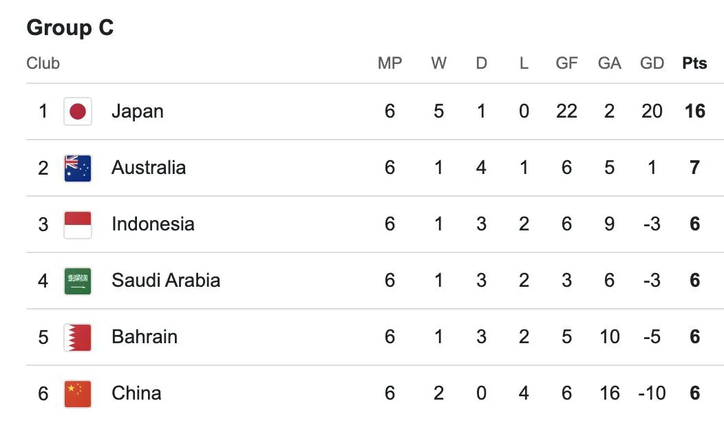 国足主场1比3不敌日本,印尼主场2比0爆冷击败沙特,巴林主场再次补时失球被澳大利亚绝平,18强赛第6轮战罢,C组出线形势更加胶着。日本队积16分一骑绝尘,第2名澳大利亚也仅积7分,印尼、沙特阿拉伯、巴林和中国同积6分。遥遥领先的日本队只需明年3月主场击败巴林,即可基本提前锁定出线。其余5支球队未来4场比赛任何结果,都将决定另1个直接出线名额和2个附加赛名额归属。