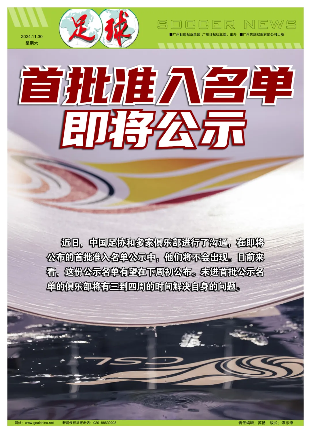 近日,中国足协和多家俱乐部进行了沟通,在即将公布的首批准入名单公示中,他们将不会出现。期间俱乐部方面一度有消息表示,公示名单会在11月29日公布,但最终延期,目前来看,这份公示名单有望在下周初公布。当然,未进首批公示名单的俱乐部有三到四周的时间解决自身的问题。