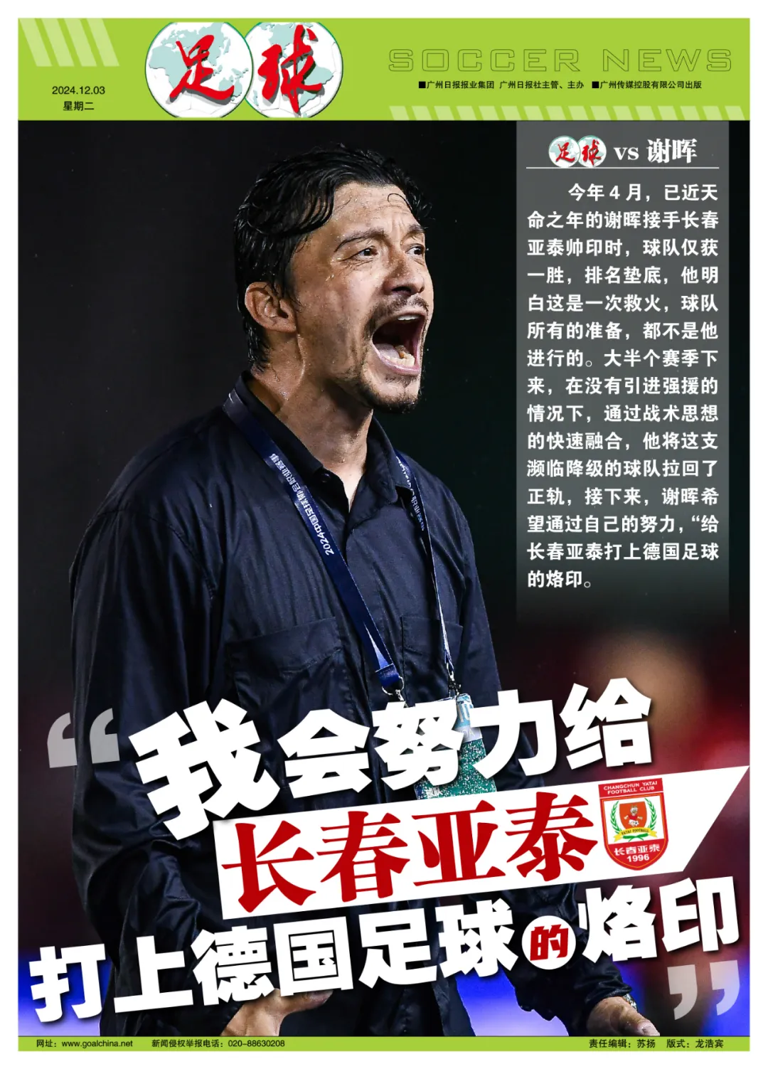 今年4月,已近天命之年的谢晖接手长春亚泰帅印时,球队仅获一胜,排名垫底,他明白这是一次救火,球队所有的准备,都不是他进行的。大半个赛季下来,在没有引进强援的情况下,通过战术思想的快速融合,他将这支濒临降级的球队拉回了正轨。接下来,谢晖希望通过自己的努力,“给长春亚泰打上德国足球的烙印。”
