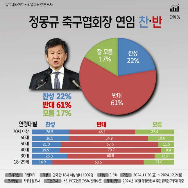从最近的民意调查结果来看,郑梦准已失去了大多数韩国人的信任。民意调查公司Real Meter11月30日至12月2日进行的调查显示,高达61.1%的受调查者反对郑梦奎连任韩国足协主席,支持连任的仅有22.3%,还有16.7%表示“不确定”。18到29岁年龄段受调查者支持连任占比最低(14.9%),说明韩国年轻人对郑梦奎的认可度最低。