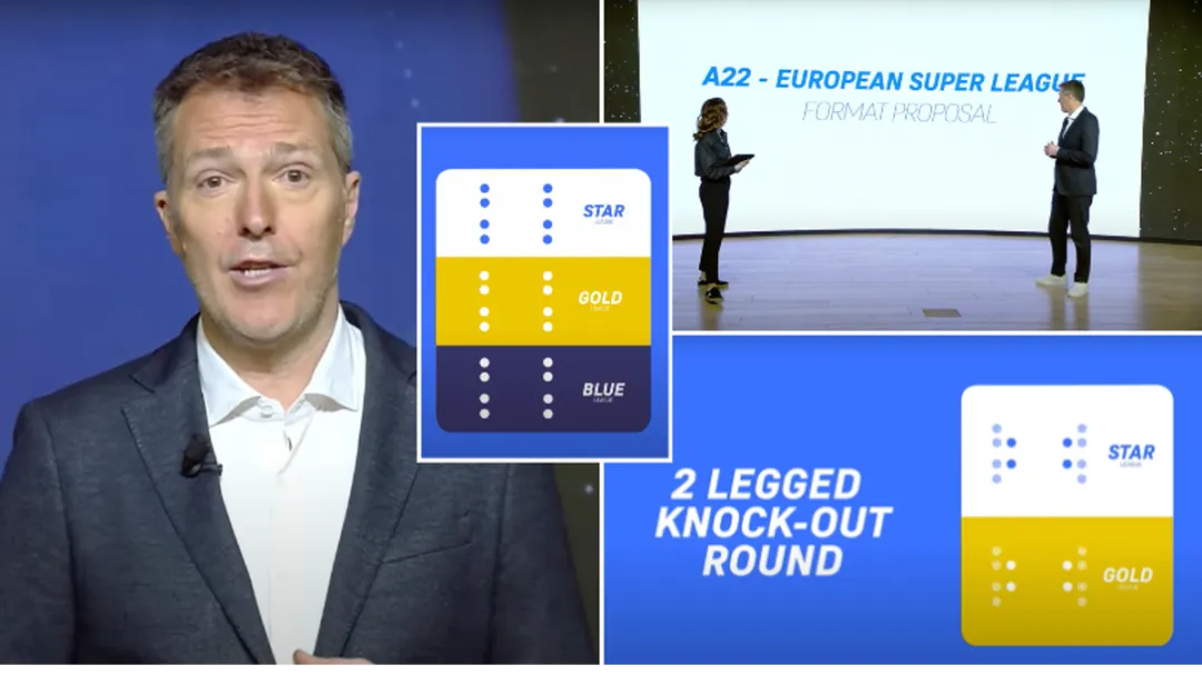 在之前赛制受到诸多反对之声后,A22公司全面修改了欧超联赛赛制。全新的欧超联赛将分为星级联赛、黄金联赛和蓝色联赛三个级别,星级联赛由16家顶级豪门组成,分为两组踢小组赛,主客场合计14轮。每组前四名进入淘汰赛,夺冠需19场比赛,比本赛季扩军的欧冠联赛多两场。黄金联赛16支球队,蓝色联赛32支球队,蓝色联赛每个赛季有多达20支球队降级。为争取更多支持,A22公司倾向于为勒沃库森或里尔这样拿到联赛佳绩的中小俱乐部留出空间,即三个级别均有升降级制度。