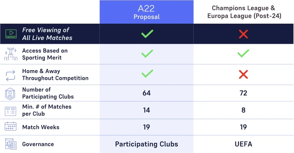据称,A22公司已接触超过100家俱乐部,60家对新版欧超表达了浓厚兴趣。虽然大巴黎、拜仁和曼城明确拒绝加入,但A22公司表示有信心说服拜仁。如果曼城输掉英超财政公平官司,也不排除加入欧超的可能。A22公司承诺欧超参赛俱乐部可获得远超欧冠的版权、奖金和商业收入,A22公司甚至还在开发免费流媒体平台,平台每赛季还可带来10-20亿欧元额外商业收入。