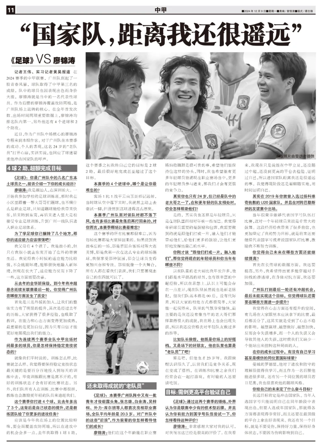 近日,作为广州队中场核心的廖锦涛专程来到本报作客。对于广州队在本赛季的成功、个人的表现,这名24岁的“老队员”打开心扉,实话实说,也回应了球迷要求他冲击国家队的呼声。
