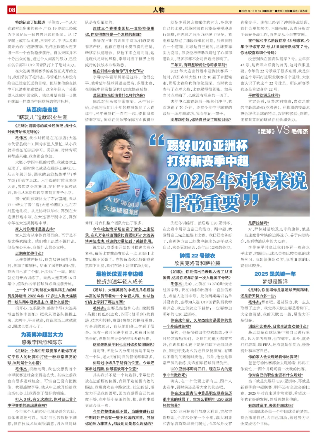 当下就是先踢好U20亚洲杯,再就是新赛季的中超联赛,明年还有全运会的比赛。2025年对我来说非常重要,希望这一年我有好的发挥,然后再想其他的。