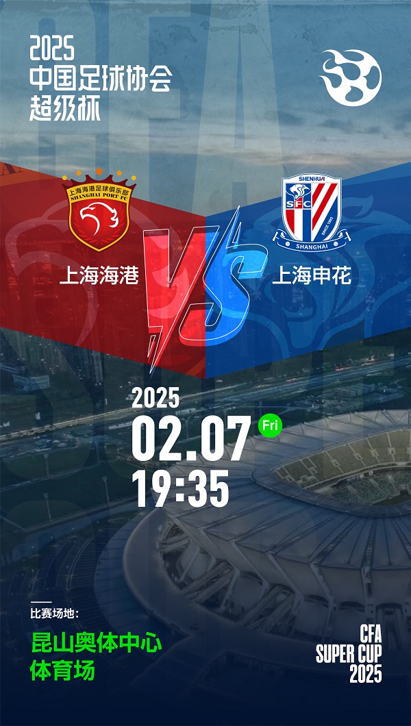 申花2025赛季的首战时间也已经确定。日前,中国足协宣布申花与海港的2025“超级杯”将于2月7日19时35分在昆山奥体中心体育场进行。