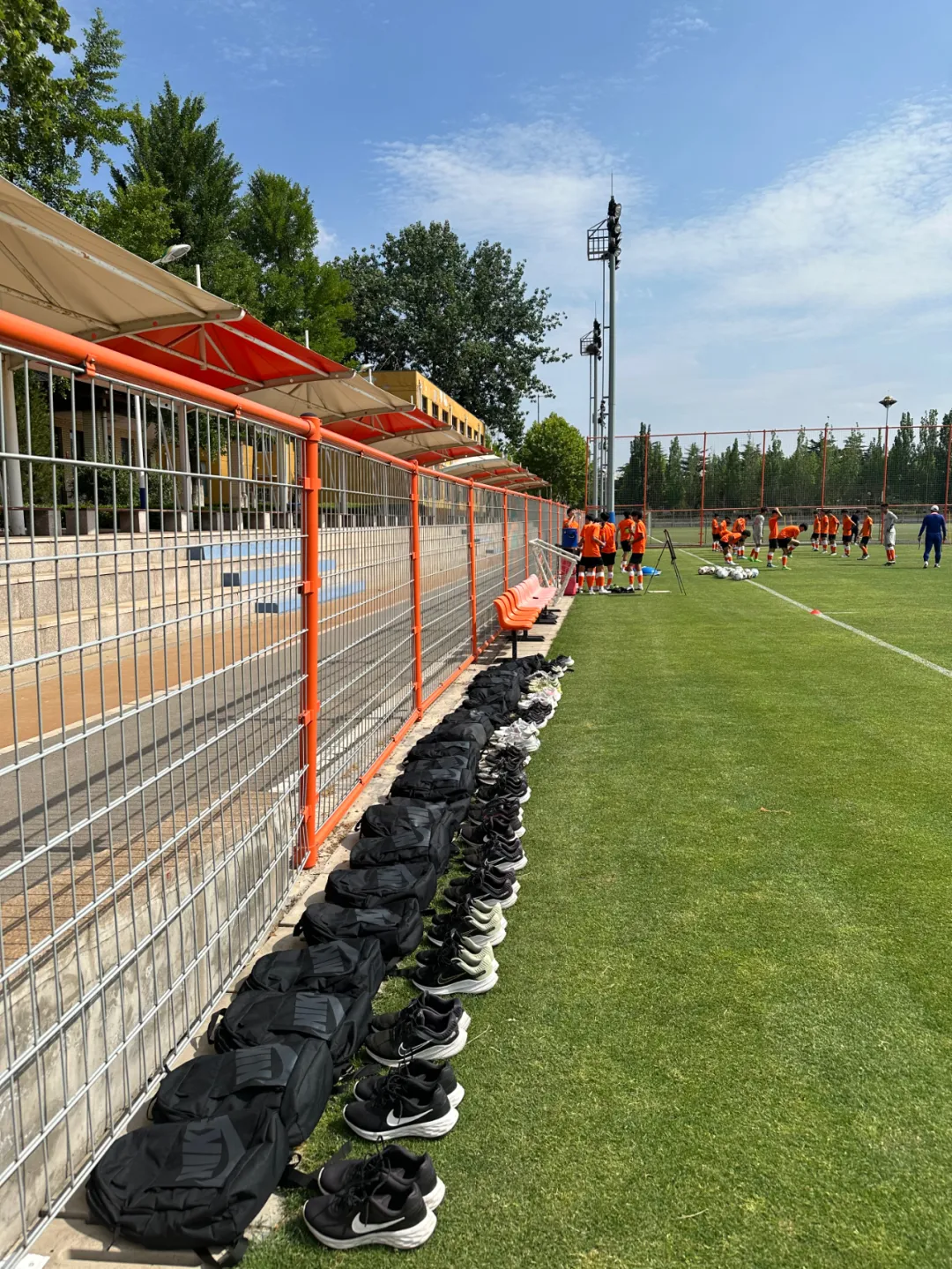 还有一种方式是两个人的全场进攻训练,整个过程有冲刺跑,有绕杆,快慢结合,最后冲刺到门前完成射门,再冲刺回到中场,一趟下来150米左右。模拟的是后场到前场的进攻,这个过程有高强度跑,也有配合,最终完成进攻之后再快速回防,同样是高强度结合高负荷的技术动作应用。